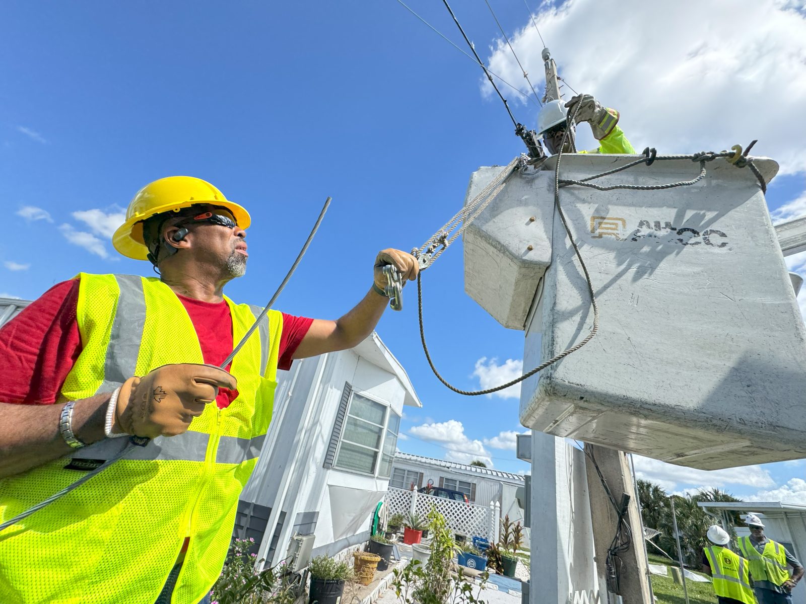 Lineworkers from Harlan Electric and other MYR Group subsidiaries L.E. Myers, Sturgeon Electric, Sturgeon Electric California, and Great Southwestern Construction (Great Southwestern) traveled to Florida from all over the United States, and as far as Portland, Ore., a 3,107-mile trek from one corner of the country to the other in Sarasota, a town roughly an hour south of Tampa.